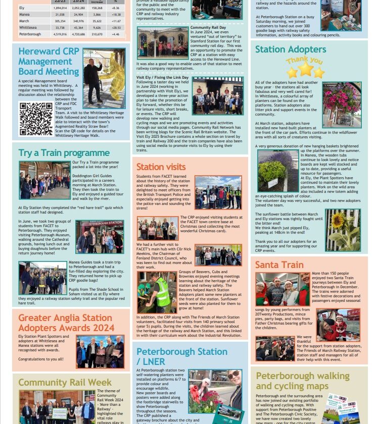 The latest annual highlights poster which is now on display in the notice boards at all Hereward Line stations gives a snapshot of some of the key events and activities the CRP have undertaken between March 2024 - March 2025. It also includes station useage figures for the last complete year - there are great results from across all five of the Hereward Line stations. The full poster can be downloaded / viewed by clicking here: